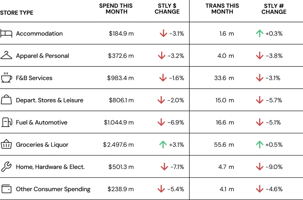 New Zealanders are having a real hard time at the moment and collectively dropped spend by -2.1% from same month last year.