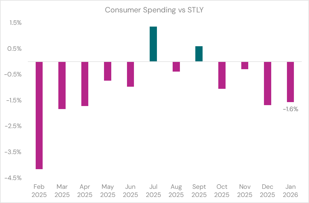 - Consumer spending dropped -1.6% in January 2026, when compared to January 2025.