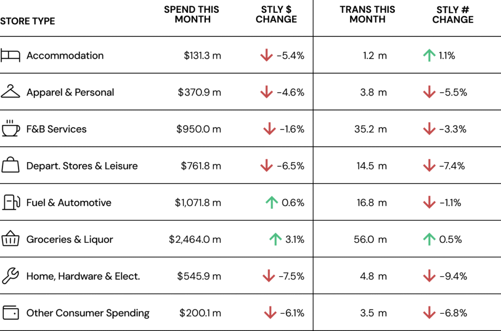 • Groceries & Liquor and Fuel & Automotive saw the only growth this month, up +3.1% and +0.6% respectively.