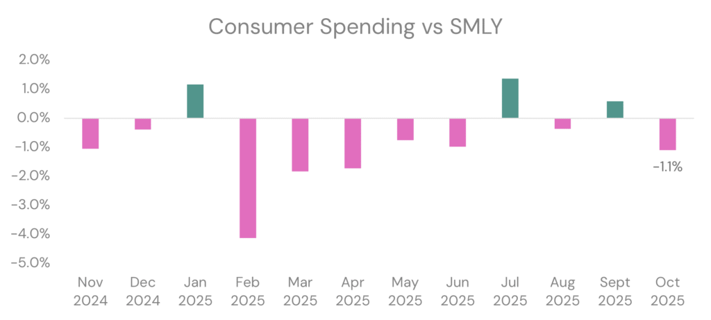 Consumer spending this October was down -1.1% on last year. The positive result last month could not be sustained in this lacklustre economy.