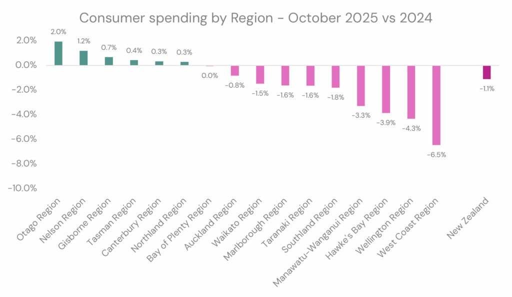 Only 6 of the 17 regions saw spend rise. Otago Region came out tops at +2.0%, with the West Coast Region at its tail with -6.5%.