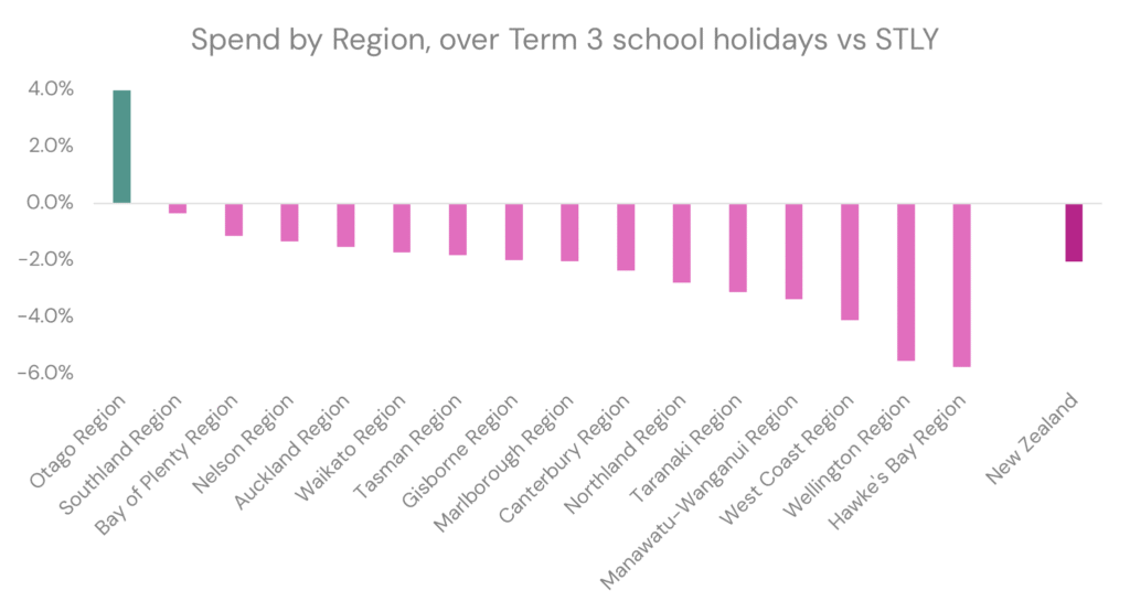 It was obvious where families flocked to over the Term 3 school holidays. Otago was the only region to see spend rise over that 2 week/16-day break, up +4.0%.